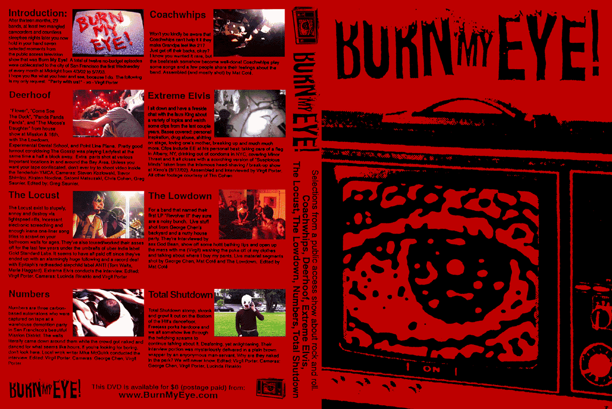 | Burn My Eye! Best of DVD. A television show about Rock and Roll. This DVD features two hours of live music and non-live stuff from the following groups: Coachwhips, Deerhoof, Extreme Elvis, The Locust, The Lowdown, Numbers, Total Shutdown. Originally airing on San Francisco Cable Access channel 29, this DVD compiles the best of the first 12 episodes. Created by Virgil Porter. This was reissued by the brittish without us on it. :( |